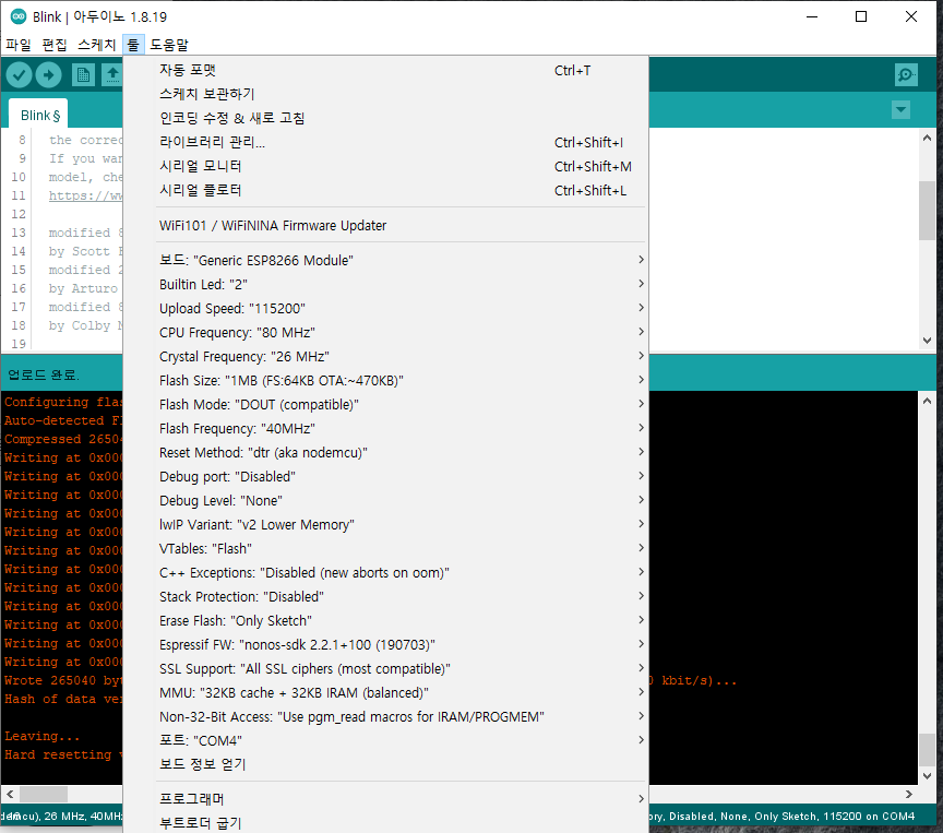 당연하게도 업로드 하는 시점에 ESP8266 의 RESET 을 GND 와 잠시 연결했다 떼어주어야 한다. 앞서 결선도라면 RESET 버튼을 한번 눌러주면 된다. 그러고나면 문제없이 스케치가 올라간다.