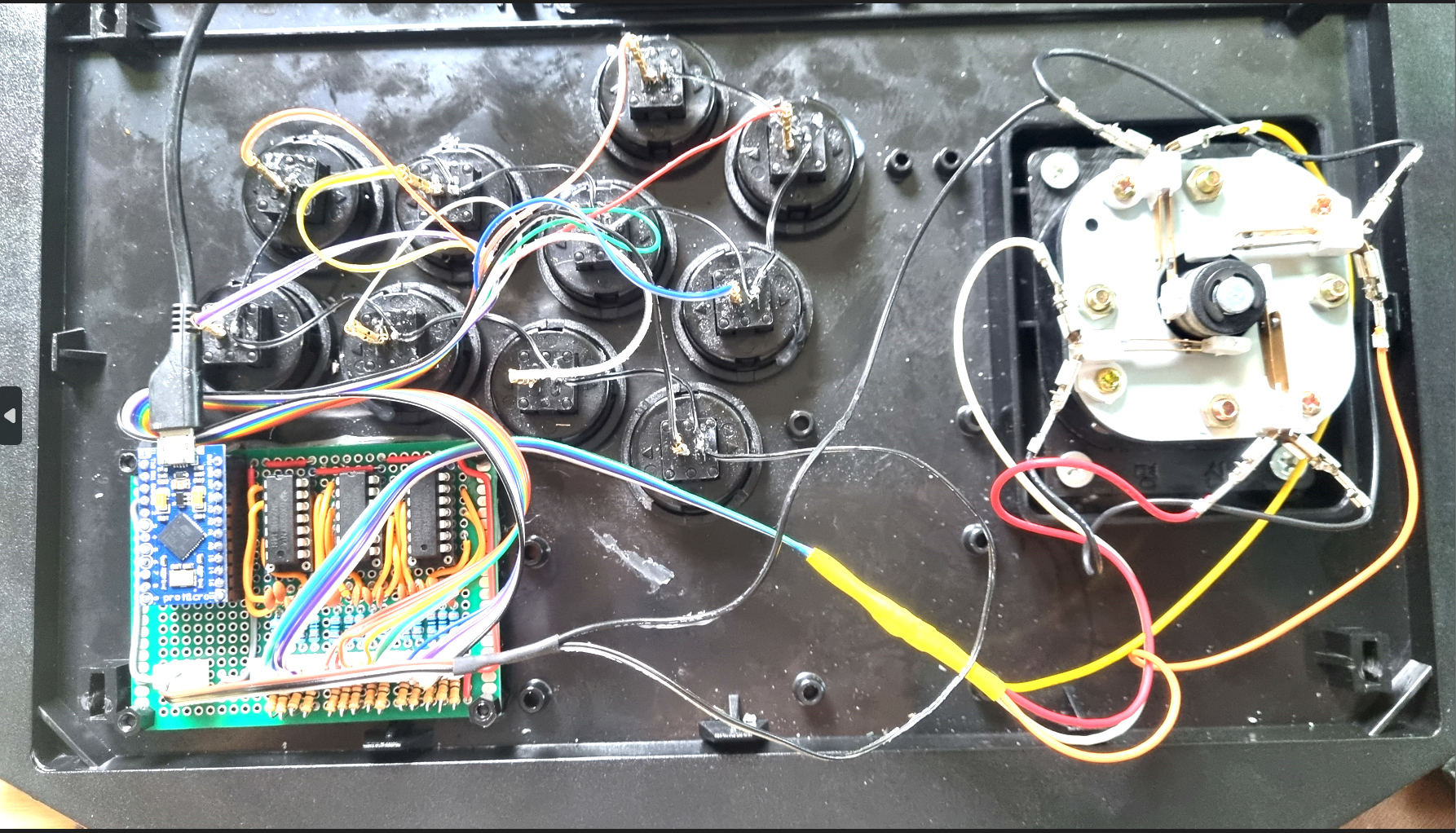 74HC14 는 총 다리를 14 개 가지고 있다. 근데,, 내가 가지고 있는 소켓은 15 핀 짜리네? 뭐..어쩔수 없지. 이거라도 써야지 ㅎ. 좌하단에 2 핀 짜리 JST XH 소켓은 GND 로 쓸 것이고, 그 다음 4 핀 짜리는 스틱의 4방향 핀. 나머지 5 핀 짜리 2개는 각각 1 ~ 5 번 버튼, 6 ~ 10 번 버튼을 위한 것이다.