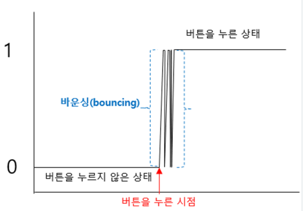 가장 손쉽게 해결 할 수 있는것은 버튼의 상태를 10~30 ms 정도 단위로 delay 를 주면서 읽는 것이다. 그러면 위의 현상을 어느정도 제거할 수 있다. 100%가 아닌 어느정도라고 표현한 이유가 있다. 만약 버튼을 누르는 속도가 30 ms 이하라면, 입력이 무시된다는 뜻이다. 즉,, 사람의 반응속도를 추정하고, 이보다 빠른 입력을 강제로 막는 방법으로 볼 수 있겠다. 재수가 없어서 바운싱이 30 ms 보다 길어진다면, 의도한대로 동작하지 않게 된다. 겁나,,찝찝하지 않은가?