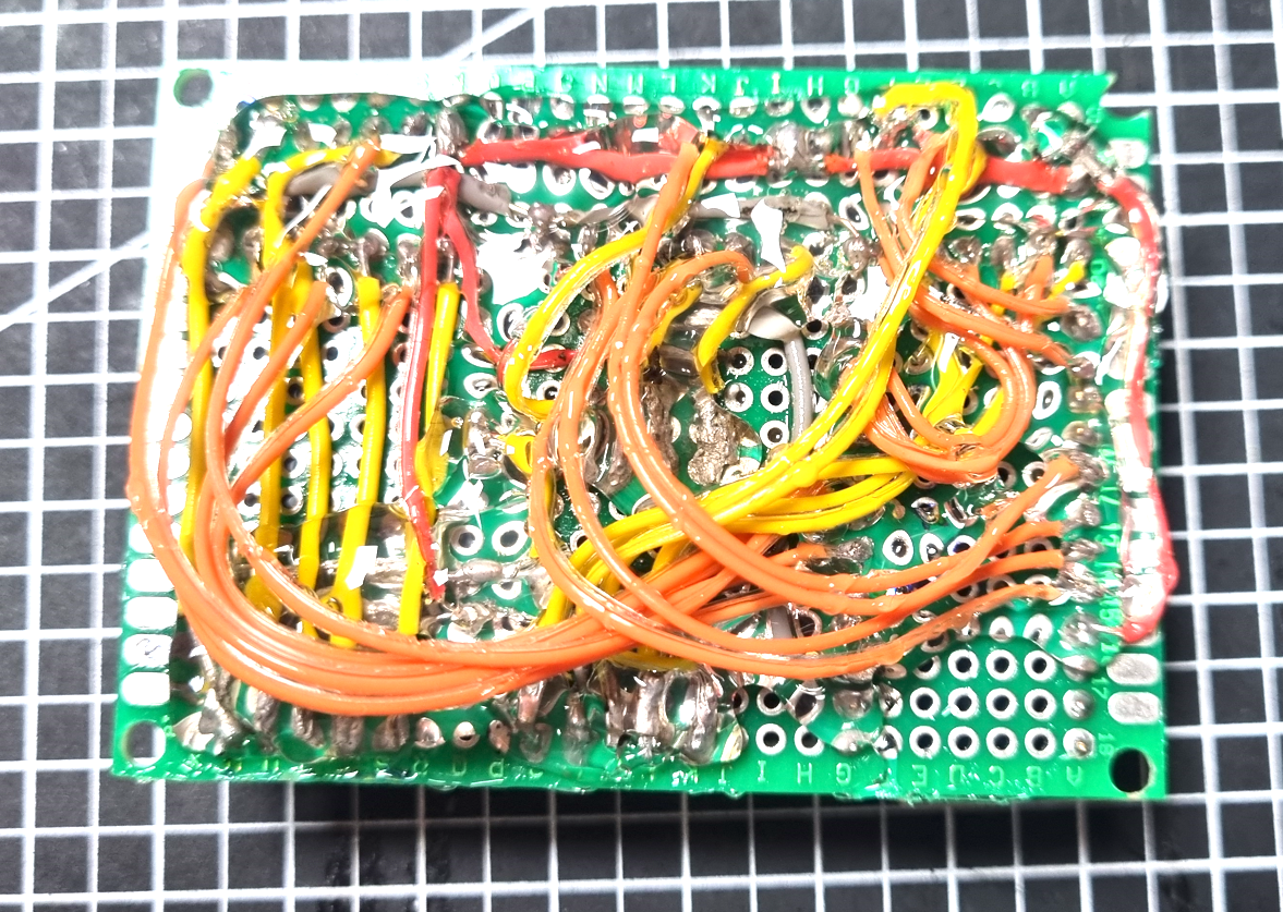 후...여기까지가 74HC14 의 Output 핀과 아두이노 기판의 연결을 제외한 모든 연결을 마친 상태이다. 이제 가장 큰 놈이 남았다. 74HC14 에서 총 14개의 선을 아두이노 기판에 연결해야 한다. 문제는 자리가 너무 협소하다. 앞판에 이 모든것을 우겨 넣는것은 거의 불가능하다고 판단되어, 해당 연결은 뒷판에서 하기로 했다.